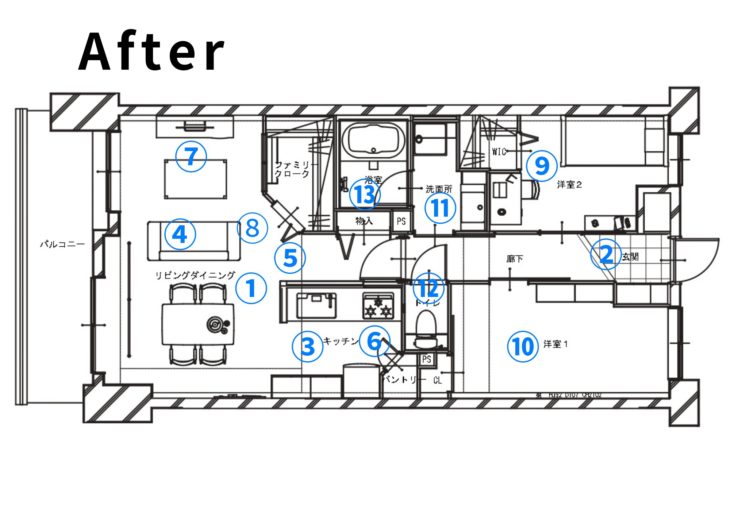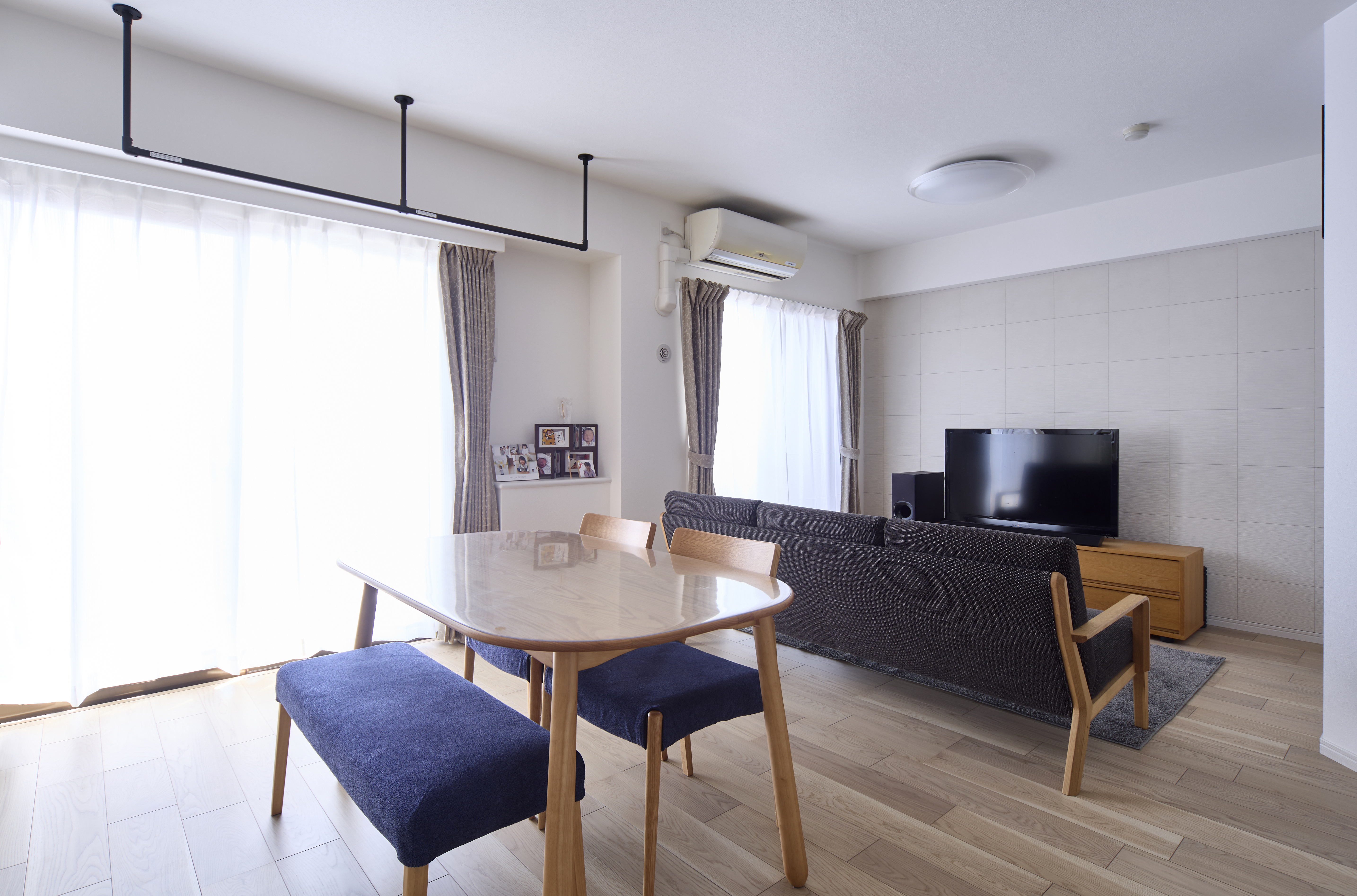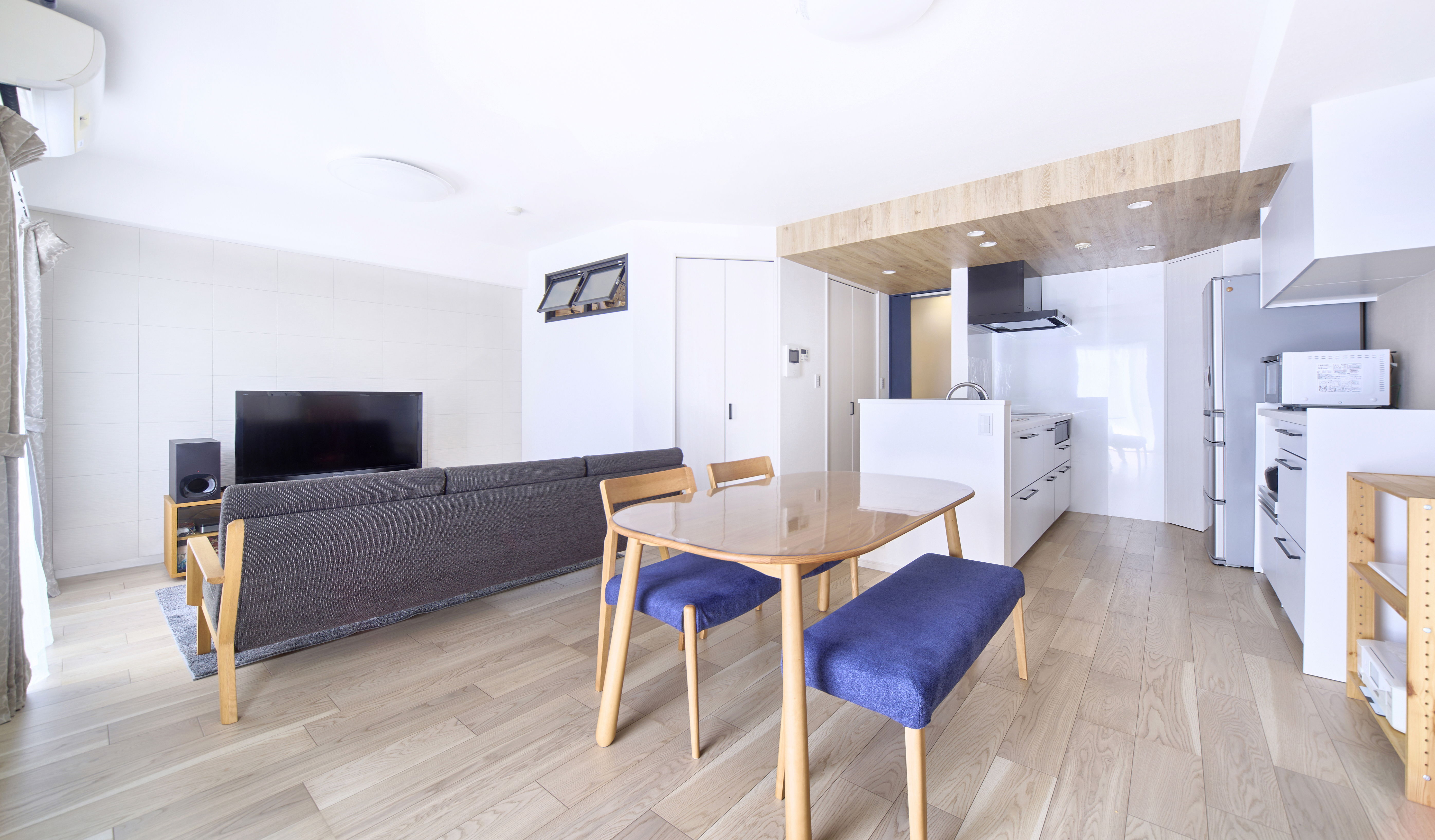 ①以前は内装がひと世代前の感じでしたが、床は新色のグレージュフローリングに貼り替え、グレーやベージュのクロスとブラック・ネイビーのアクセントカラーを加えて、上品で明るい雰囲気になりました。