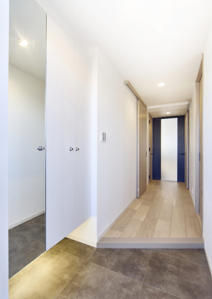 ②「玄関が狭くて家族で帰ってくると渋滞してしまう」というお話から、上がり框を斜めにして土間を拡大しました。