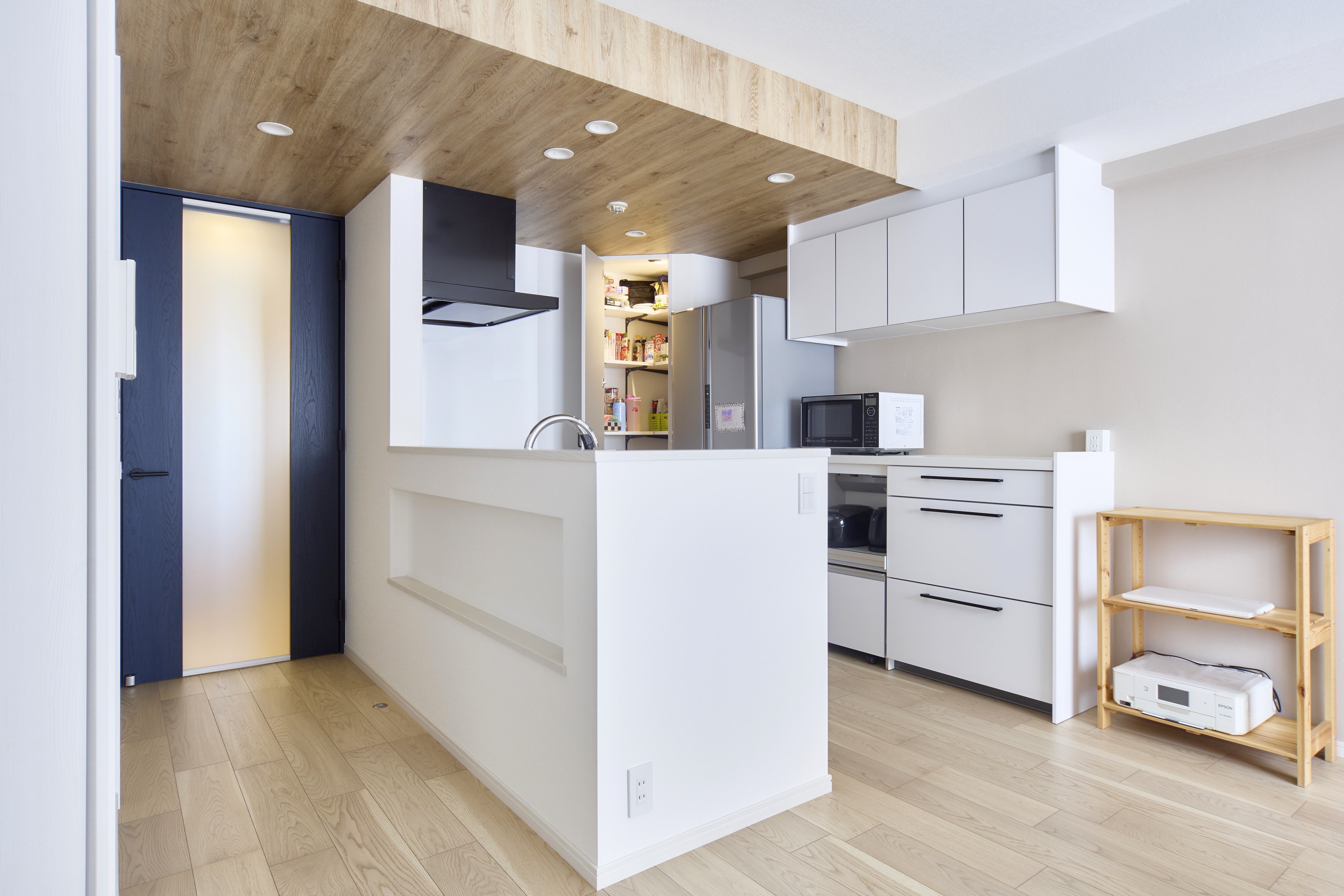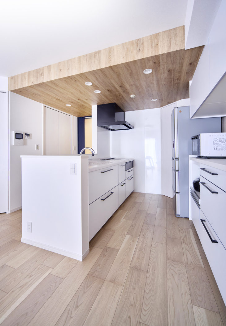 さらに腰壁にはニッチを造って小物が飾れるようにしました。キッチンの天井を木目帳にして空間のアクセントにも。
