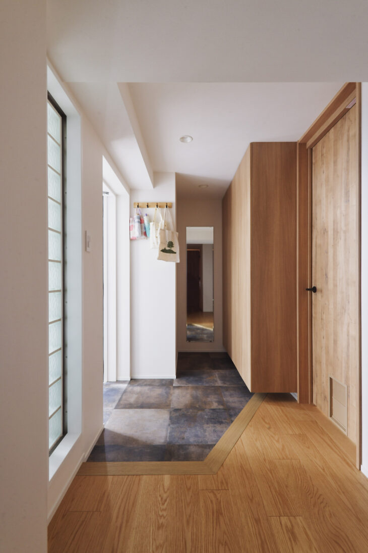 LDKの床や建具にはオークの突板を採用し、温かみのある木目が家全体を包みます。カラーはグレーをアクセントに取り入れ、落ち着きとやさしさが調和した空間に。リビング横の和室は撤去して防音室やワークスペースを設けることで、家族それぞれが趣味や仕事に集中できる時間も確保しました。