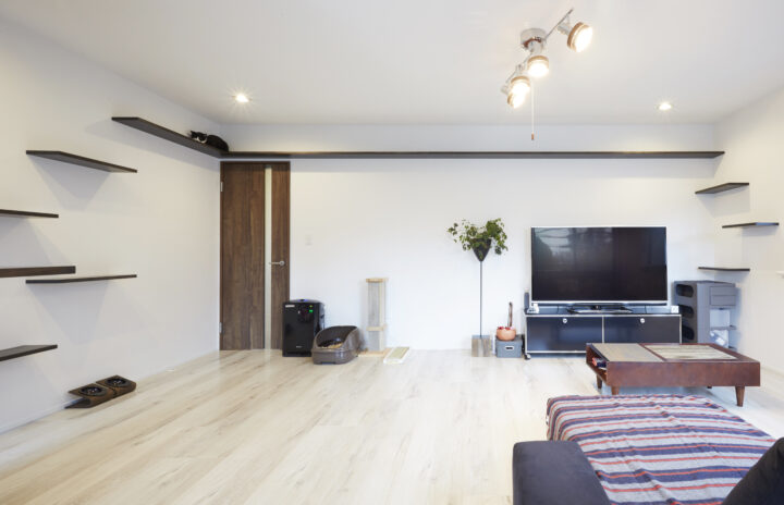 愛猫が家の中でのびのび過ごせるよう、リビングの一角にキャットウォークを設置。爪とぎによる壁の傷を抑えるため耐久性の高い強化クロスを採用し、さらに消臭効果が期待できるエコカラットも提案した。