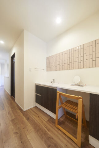 部屋にせず、あえてオープンにして見せる洗面化粧台は、奥様のメイクコーナーとしても使える空間。