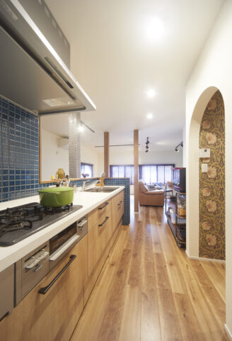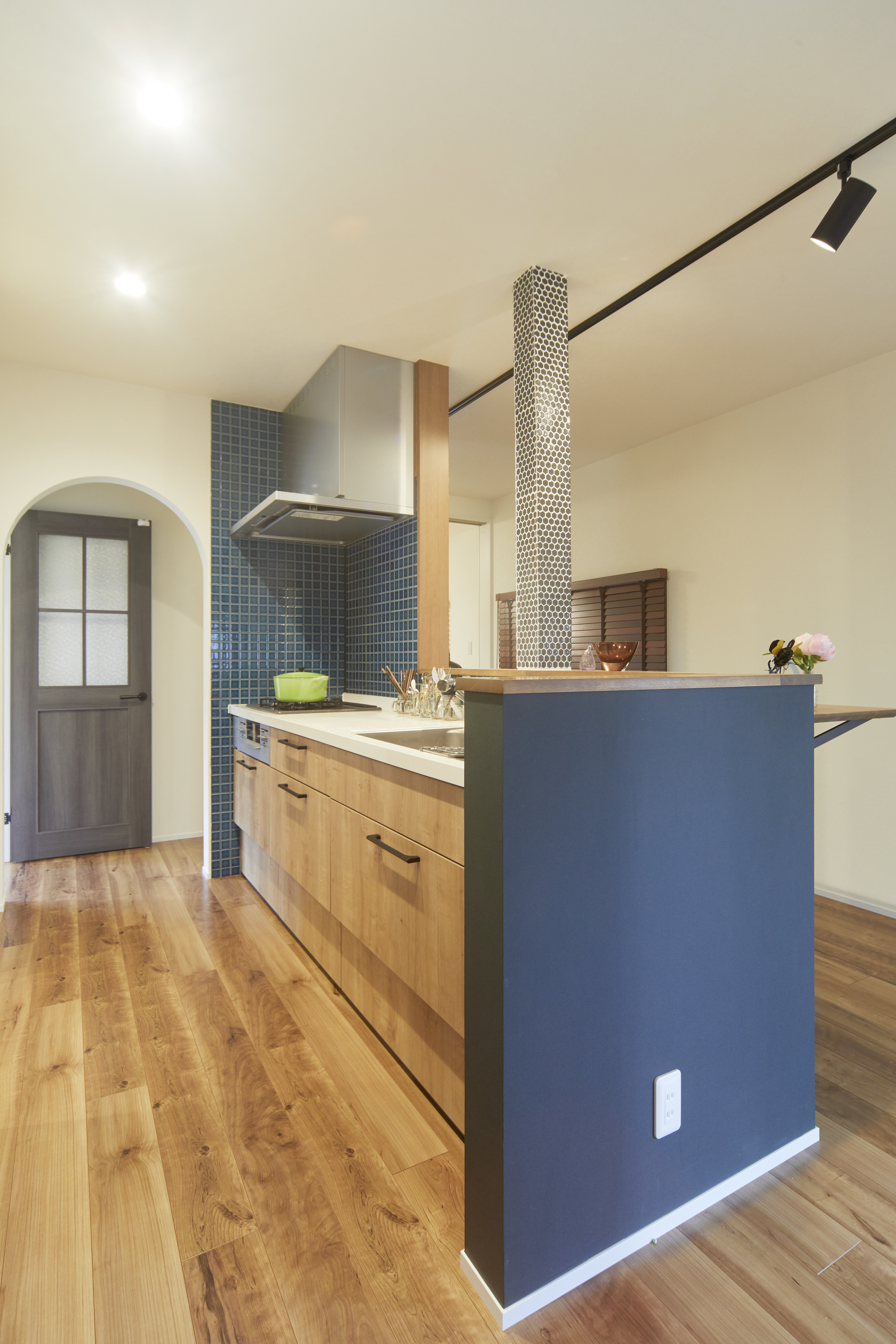 腰壁のブルーが空間を引き締める対面キッチン。