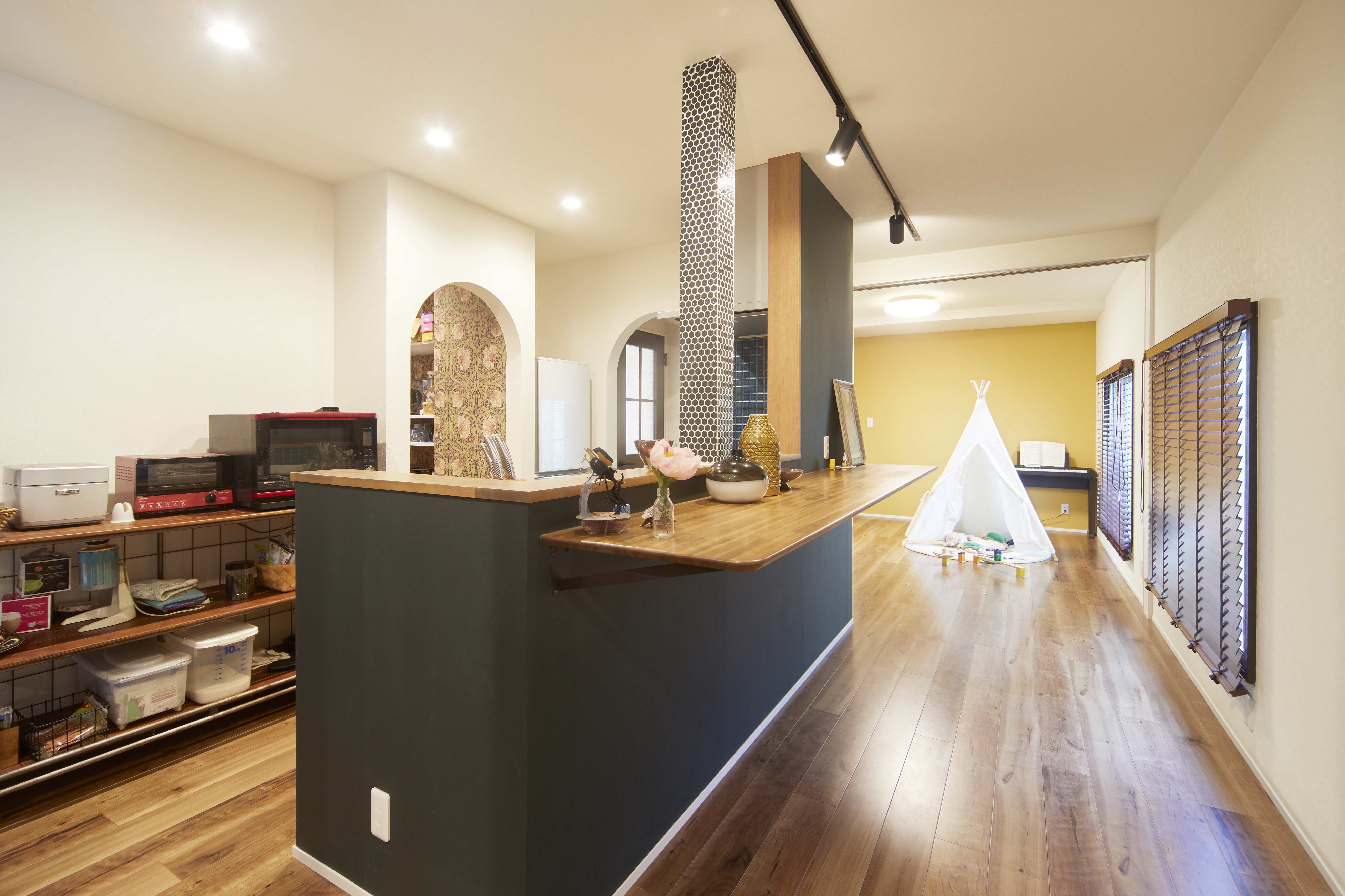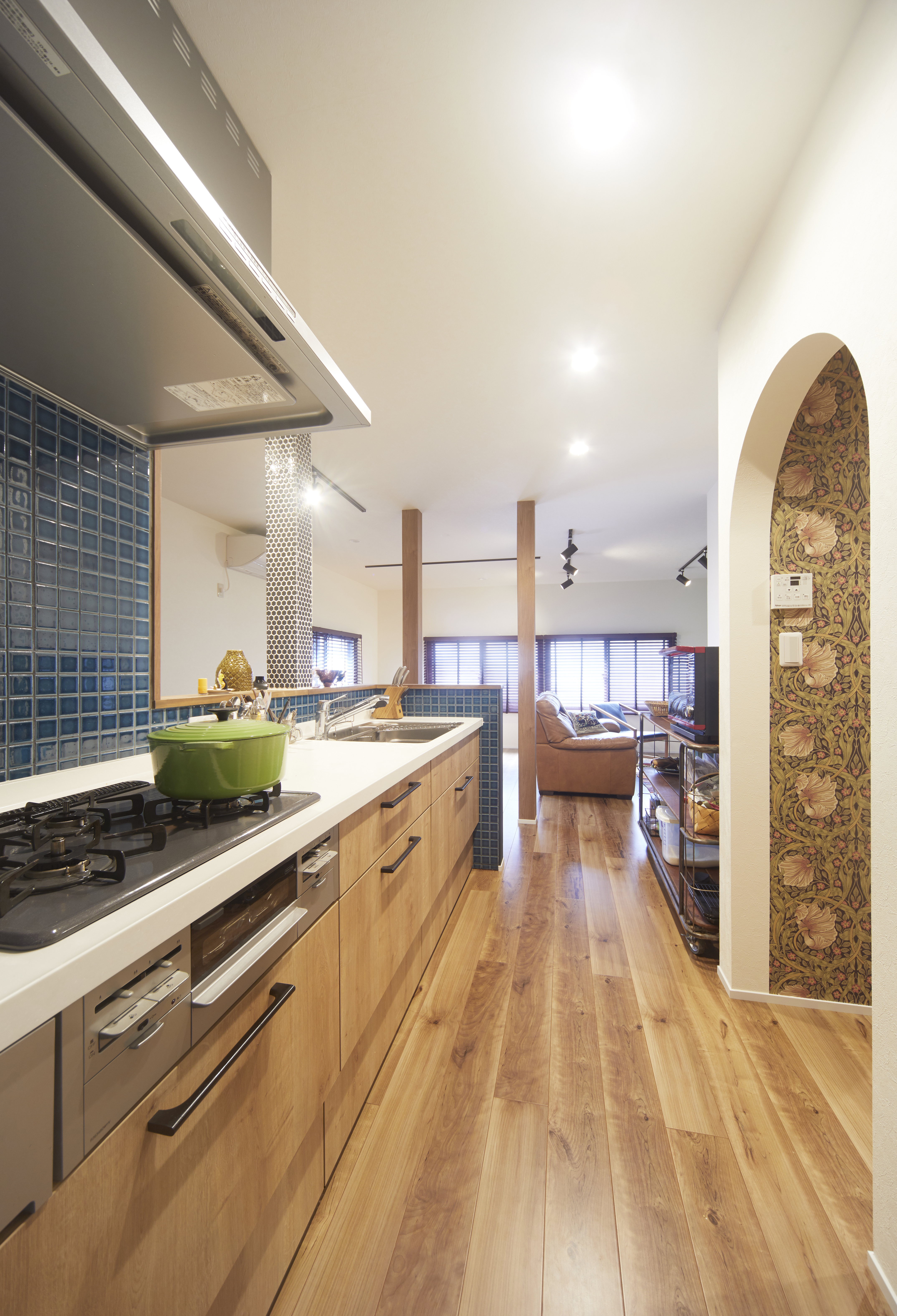 アーチ開口のパントリーに柄クロスを効かせ、インダストリアルの中に遊び心を添えた。