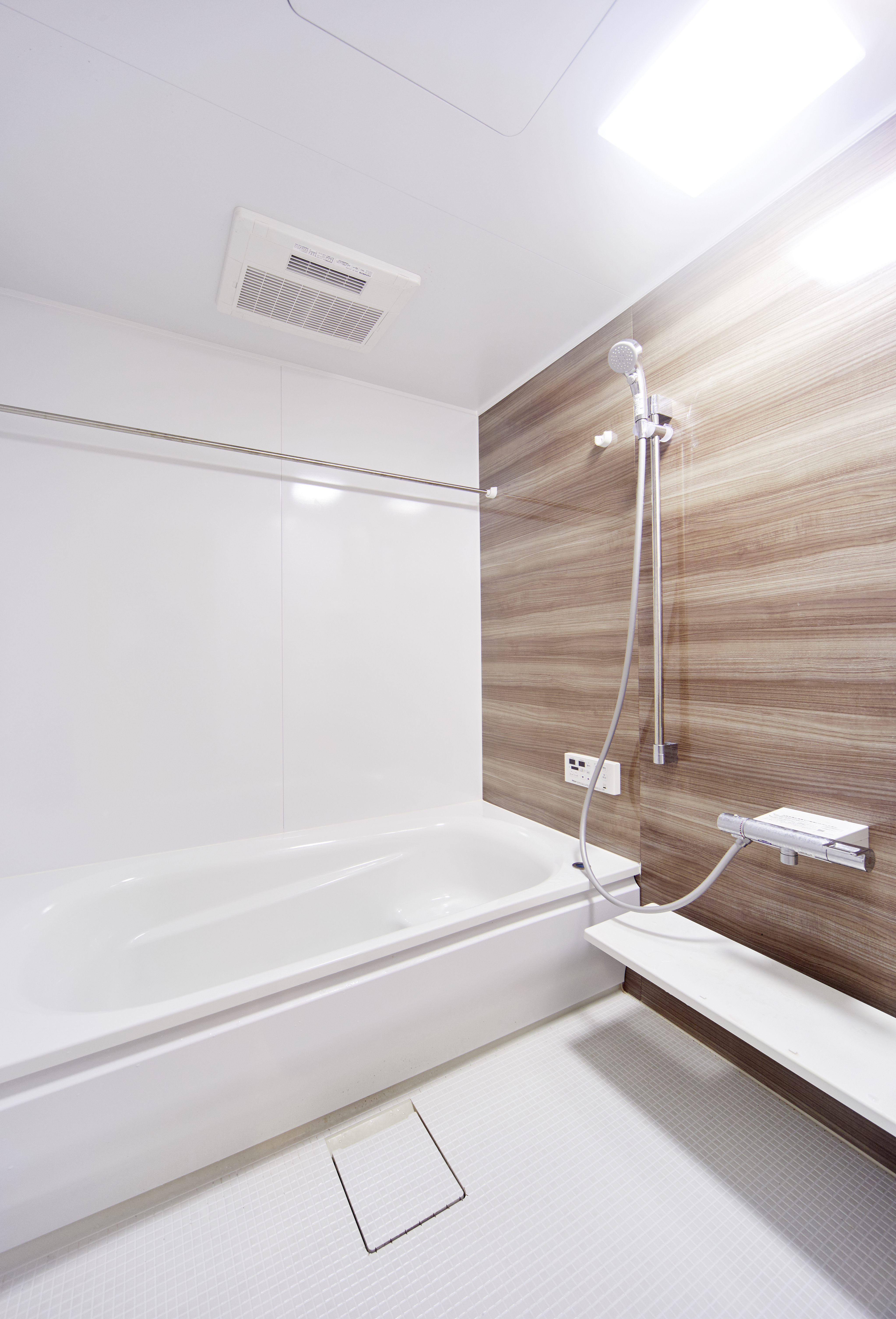 木目アクセントが落ち着きを添えるバスルーム。