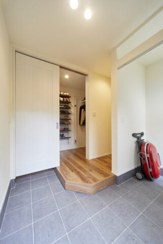 シューズインクローゼット以外にもう一つ収納をつくり、アウトドア用品やお子様の自転車をすっきり収納できるようになった。