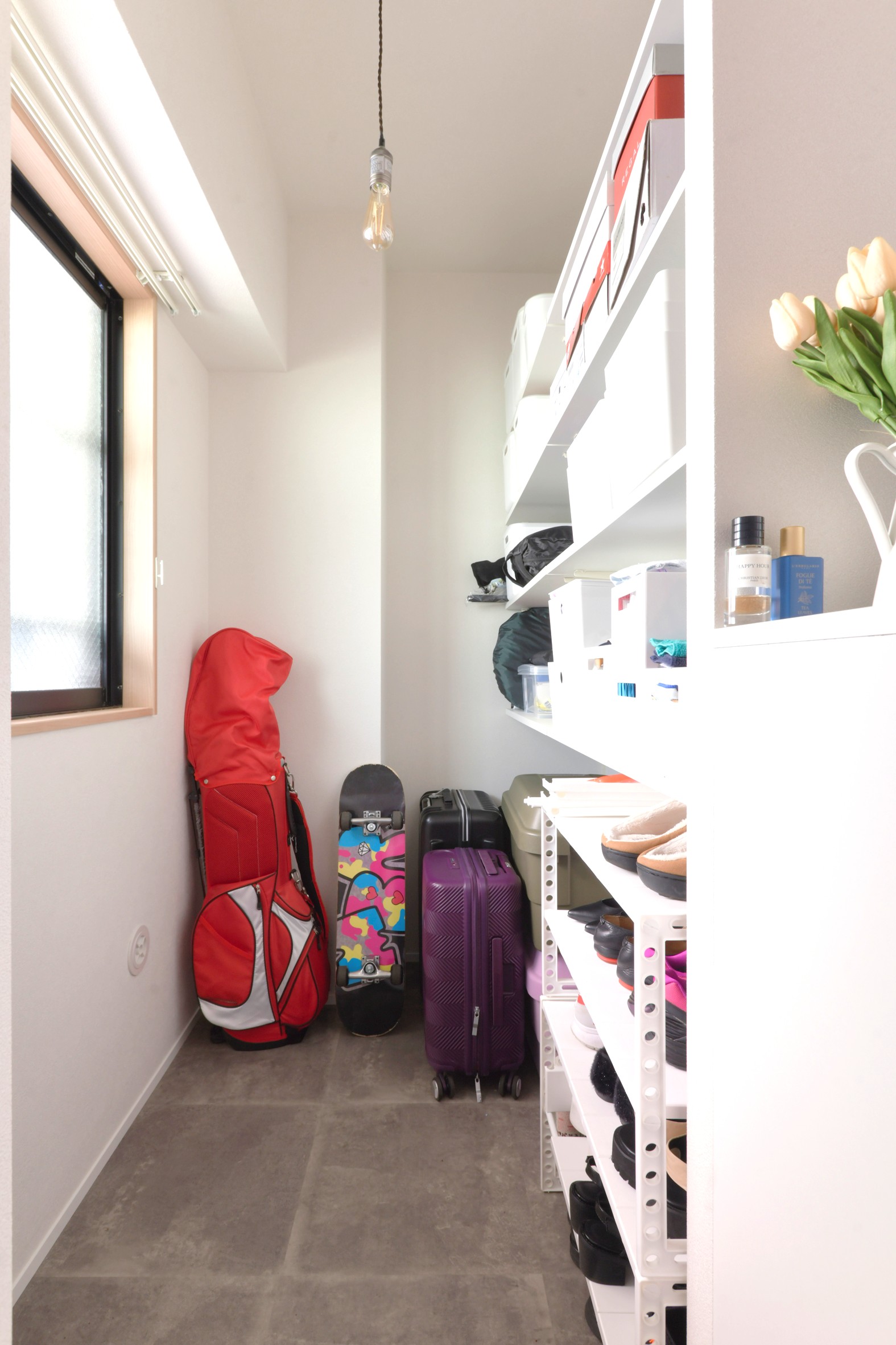 押入れ撤去による収納減を補うため、玄関に土間収納を新設し、収納量を確保。